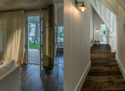A place where you feel right at home. Waking up to the sun rising on the lake and the thought of another stress free day. This design creates such a warm an inviting atmosphere, but also very refreshing with the bright white slat walls and ceilings and large windows throughout bringing in the natural light that highlights the texture and rich tones of the reclaimed hemlock floors.