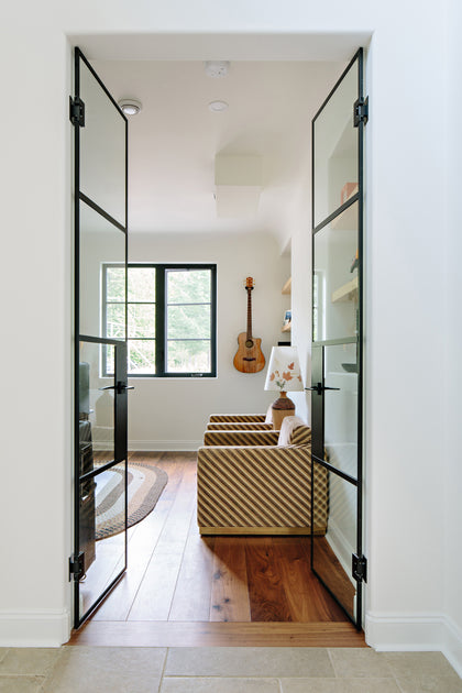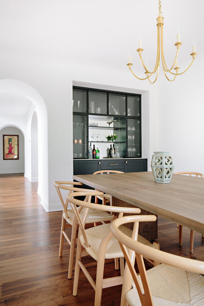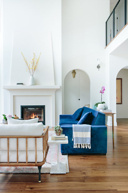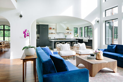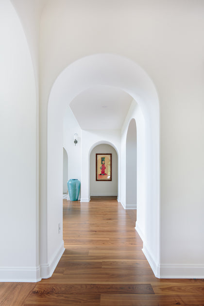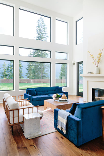 Mari Kushino Design brings a modern, curated aesthetic throughout, layering texture and tone. Clean white walls and arched hallways set a calming stage for bold elements: velvet navy sofas, sculptural chairs with exposed wood frames, and a woven coffee table. The Revelstoke flooring flows throughout, soft underfoot and visually seamless.