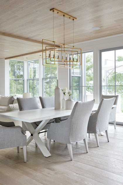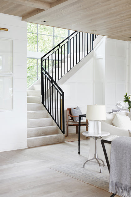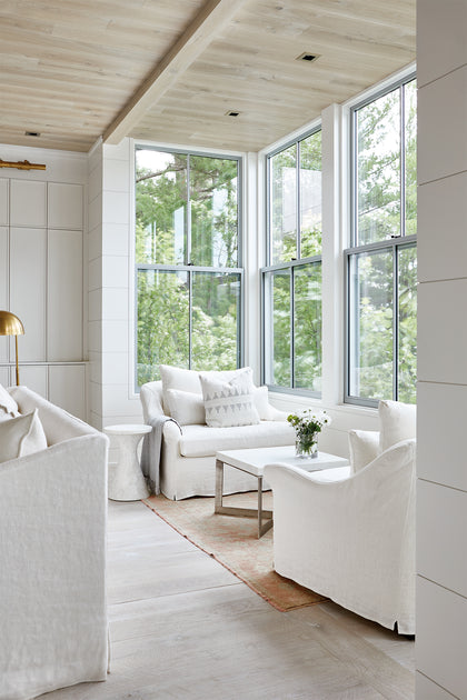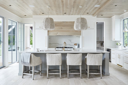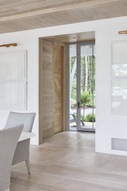 Contemporary upgrades and expert use of texture bring the Riverdale residence in Muskoka, Ontario a step above the typical lakehouse aesthetic. Shiplap and board and batten exteriors call to mind classic waterfront homes while our Cape Cod White Oak and Dover European Oak add subtle colour to the crisp white on white interior. The warmth and versatility of our Dover wide plank shines as a ceiling and range hood treatment, while the 9 inch Cape Cod channels the mood of its namesake. With tones that mirror weathered fences and pale sandy beaches, our white oak flooring and stair treads ground the airy space and keep it close to its waterfront roots. Designed by Muskoka Living, Riverdale’s furniture feels like summer whites in soft, lived-in linens and easy wearing slipcovers. The rustic doors and rooms punctuated by rope and polished brass details nod to the nautical without shouting it out. Muskoka Living’s casual, coastal flare and custom furnishings elevate the classic lakehouse, building on tradition with refined updates.