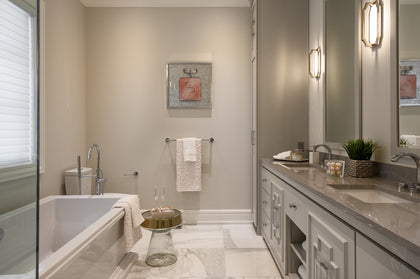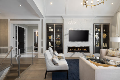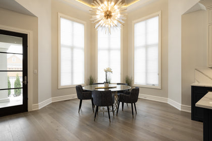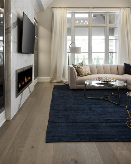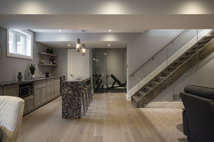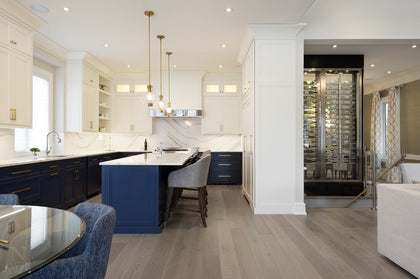 This luxury home was designed in the tradition of old world European with luxury finishes and details, seen in everything from the cabinetry to the furniture and the specialty wide plank flooring. Key details in this home make an impressive statement such as the glass wine wall that separates the dining room from the great room and the beautifully designed duotone kitchen that compliments the grey tones of the Tremblant wide plank flooring.