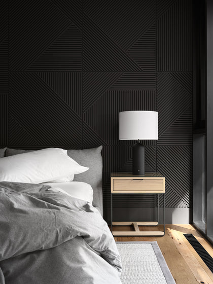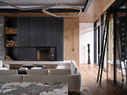 Offset by intricately woven wall paneling, the simplicity of the floating, cantilevered staircase offers yet another juxtaposition. A central wine wall and use of stone slabs continue the theme. Experienced as a whole, the home cohesivley fulfills its vision, creating spaces that inspire, energize, and also create calm. Nothing contradictory about it.