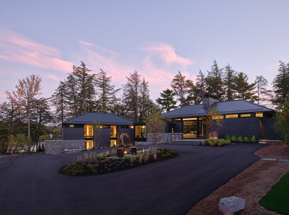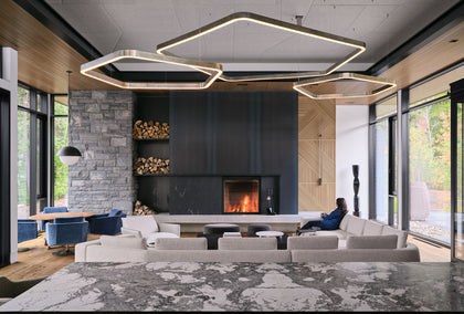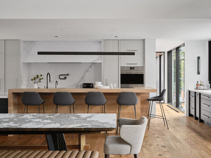 In fact, the natural details and brushed grain on each plank influenced the colour palette for the rest of the home. Look no further than the black windows and exterior doors that mirror the dark imperfections found in the reclaimed planks. Meanwhile, the brightness of the Reclaimed Oak plays perfectly off the interior doors and trim. The continuity of design is completed by cedar soffits that allow the eye to move seamlessly from inside to the wooded outdoors. Transitions – such as, from the bedroom wing to the main living space – are another recurring design theme. Kayne used low-to-high ceiling heights to create a sense of intimacy in the private spaces, which unfolds to a grand open area appropriate for entertaining.