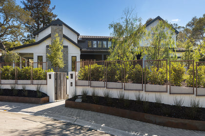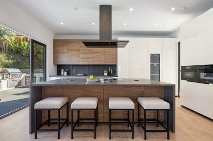 The ‘cabriolet’ style kitchen and great room, with dramatic high ceilings, 50-foot open span, and retractable window wall, erase the boundary between indoors and out, seamlessly integrating the home with the south garden where the pool, spa, outdoor kitchen, gas firepit, and lawns are an absolute delight.