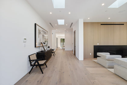 Character grade Del Mar White Oak wide planks from our Iconic Collection are used throughout. The light natural colour and wire-brushed surface of the wood have a timeless appeal that resonates with the sun-soaked home and its verdant garden vistas.