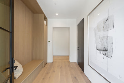The crisp white palette and clean lines create a minimalist canvas that accentuates the warmth and rich texture of the wide plank floors which bring a relaxed elegance to the design.
