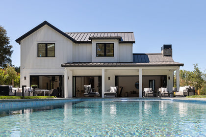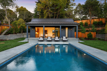 Mirroring the architecture of the main house, the fully retractable window wall of the pool house welcomes extended entertaining, serving as a game room, or posh guest lodging with a kitchen and laundry. This is open-air living at its best.
