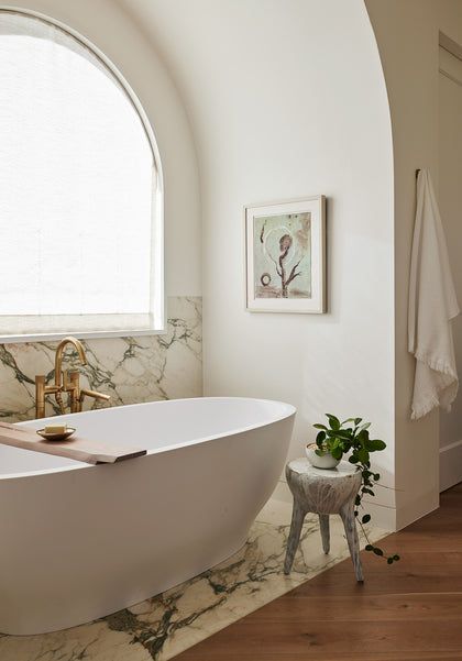 The primary bathroom's free-standing tub, featuring a unique green Calacatta, adds another touch of luxury to the home, reflecting the surrounding hillside's brush––a colour story that continues from room to room. The kitchen island, crafted from white oak, harmonizes seamlessly with the European oak floors, and a walnut dining table invites warmth into the heart of the home. Each space was orchestrated to achieve the balance of impressive, yet comfortably casual, with carefully selected materials and colours guiding the narrative.