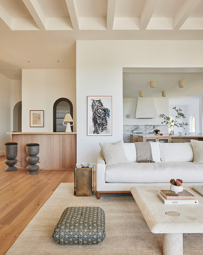 In the main living area, a Dmitriy & Co Kessel Sofa takes center stage, flanked by New Works Covent chairs and a Danny Kaplan Lamp, creating a harmonious blend of textures and tones. Kristen Ekeland's commitment to purposeful design is evident throughout, from the high ceilings enhancing the sense of openness to the curved ceiling and arched doorways, creating an inviting atmosphere.