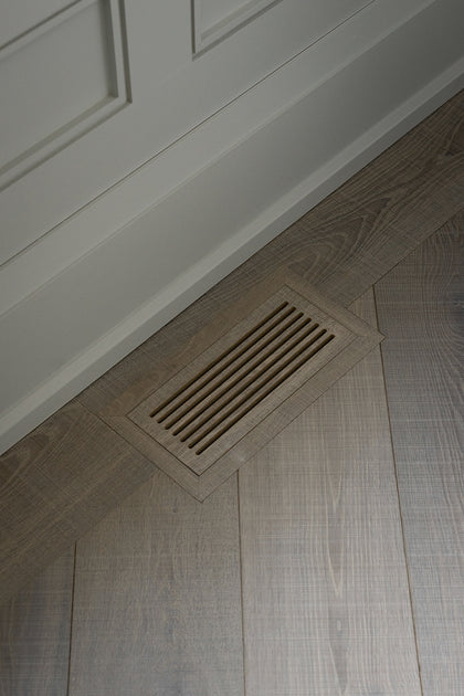 Bearing distant saw kerf markings and a warm grey colour palette, Nordic European Oak wide hardwood planks have decidedly heritage feel. Arranged in herringbone patterns in various spaces throughout this house, the hardwoods create interest while denoting a change in setting.