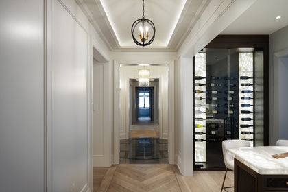 Upon Entry into the homes spacious foyer, the country house design theme unfolds, albeit through a contemporary lens, highlighted with clean lines punctuated by detailed focal points. Moving from one setting to the next, the space strikes a balance of natural beauty and contemporary elegance. This is evident in the traditional millwork and wall paneling juxtaposed by dramatic, modern chandeliers and lighting fixtures, giving the home a light and unique sensibility.