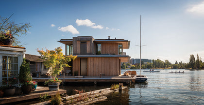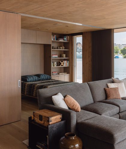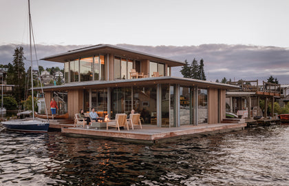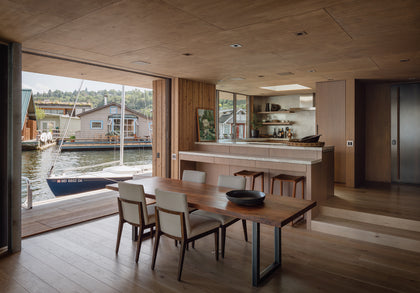 Water Cabin is located in a floating home community on Portage Bay, just south of the University of Washington. The spectacular home successfully establishes an intimate cabin sensibility within a bustling urban environment; it is at once an oasis retreat and a dynamic platform from which the owners can enjoy and engage with the surrounding waterway. Low to the water, the horizontal lines of the building echo the flat plane of the lake and the restrained colour palette, with rich use of natural materials, helps the home fit effortlessly into its setting.