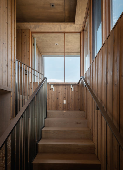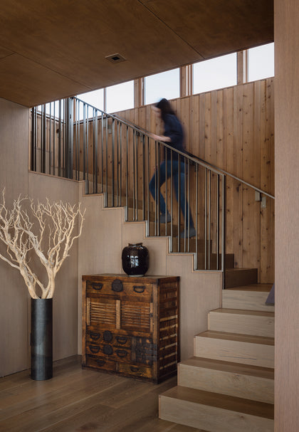 Wood features heavily throughout the home's interior, with warm oak flooring and casework balanced by cooler silver and black metals. Birch plywood ceilings extend to the exterior soffits, establishing continuity between the interior and exterior spaces. Knotty wood wall finishes in the master suite and main stairwell (which also acts as a lightwell) weave exterior materials into the home's interior.