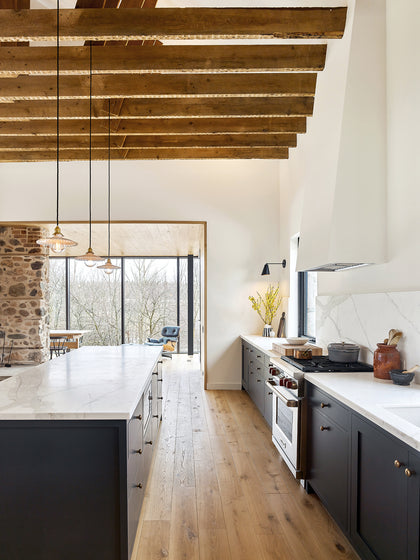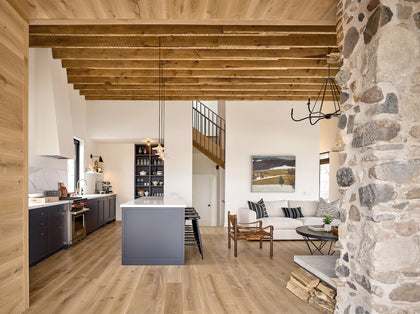 Playing up the warmth of wood against the rustic stone, our New Haven wide plank flooring is carried from floor to ceiling in the modern, cantilevered dining room. Its gentle, natural hues are echoed in the historic trusswork in the main room, creating a continuous flow from old to new.