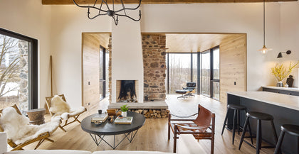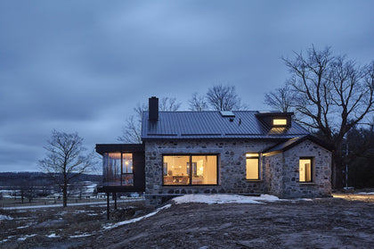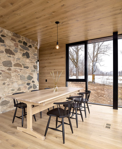 An old schoolhouse gets an unlikely new calling and a refreshing update thanks to an adventurous Toronto couple. Situated in Grey County, a rural enclave a couple hours outside of the city, this modest stone building once served as a school. With desks in the basement and one giant classroom, envisioning it as a functioning home took a little imagination. Led by architect Brian O’Brian of Works Office and Laura Fremont Design, the inventive restoration of this 1873 structure gets high marks. It preserves the history of the space without being confined to it, adding square feet, functionality, and curb appeal with a glass and steel clad dining room.Executing on the ambitious build and restoration project was Ontario based McLean Contracting. In addition to adding a 22ft cathedral skylight, their team orchestrated the custom cut in the stonework to accommodate the new addition.