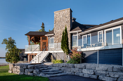 The exterior of the home, a tapestry of stone, wood, and metal, invites you to an outdoor oasis. Muskoka chairs encircle a fire pit, offering panoramic waterfront views.