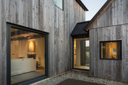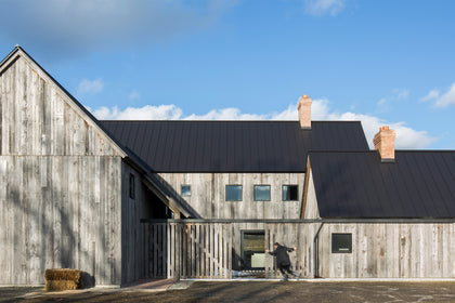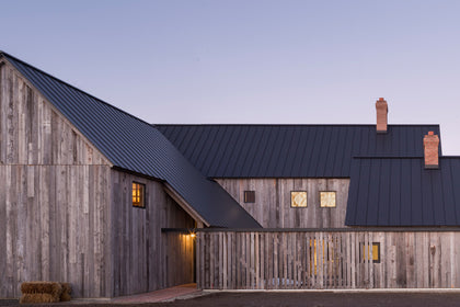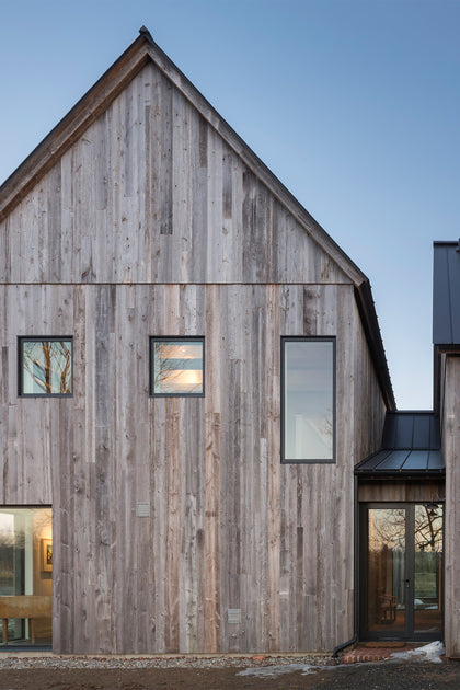 This new home in North Hatley, Quebec, takes a modern approach to the original farmhouse while still providing the comforts of a farmhouse. The homeowners’ vision was to pay homage to the old barns in this area but also create a clean interior space. Rodeo reclaimed hemlock was chosen for the exterior cladding to replicate the barn look; this product is sourced from old barns and buildings throughout Ontario where it acquires a grey aged look and texture from up to a century worth of weathering on the exterior of the barns. Inside to keep in line with a more clean and modern approach, Storm European oak wide plank was used to add a sophisticated design aspect while keeping the farmhouse feel of wood plank floors.