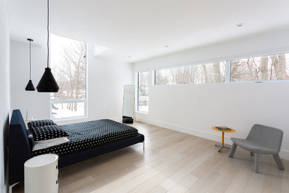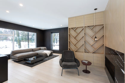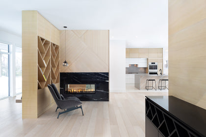 This custom home creates a modern zen aesthetic with pleasing minimal details combined with light wood surfaces and dark accents. Seen in the cabinetry, flooring and marble-clad wall, the combination of details and textures keep it simple, yet sophisticated.