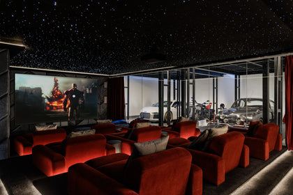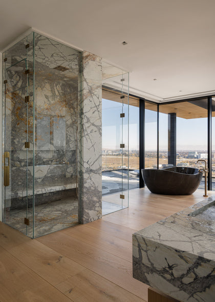 Influenced by the grand scale and clean sophistication of high-end Hollywood residential architecture, the design features soaring ceilings, ultra wide plank hardwood floors, and sleek architectural lines that frame uninterrupted views. The stone-surrounded fireplace introduces warmth and texture, grounding the room with a sense of timeless comfort. Thoughtful amenities, including a three tiered gym and movie theatre as well as an outdoor tennis court, pool, and sauna, elevate the home’s functionality without compromising style.
