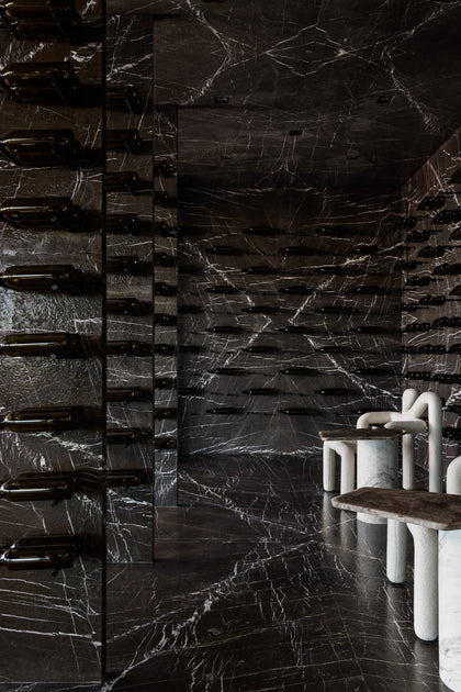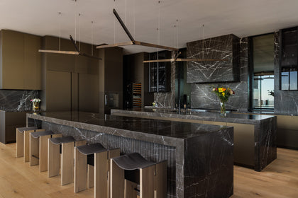 In the kitchen, bold materials and refined detailing create an atmosphere of effortless sophistication. Two grand islands carved from dramatic dark stone anchor the space with a sense of permanence, their veining enriching the warmth of the wide plank flooring beneath.