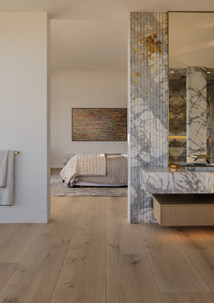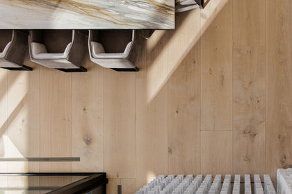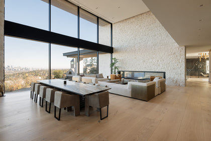 As the space unfolds, materiality continues to guide the narrative. From above, the ultra wide planks become a defining visual element, their natural character shaping the composition and revealing how each material interacts with light. The flooring was a deliberate decision. “When we began selecting materials for our home, the hardwood was the first decision we made because it would set the tone for the entire space,” shared the homeowners. “We wanted something that felt special for the scale of the house but could also handle the climate. Northern Wide Plank quickly stood out as the perfect choice. The craftsmanship is exceptional, and the planks themselves, 17 inches wide (430 mm) and a mix of 2 to 4 metre lengths, are truly one of a kind.”