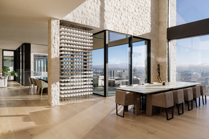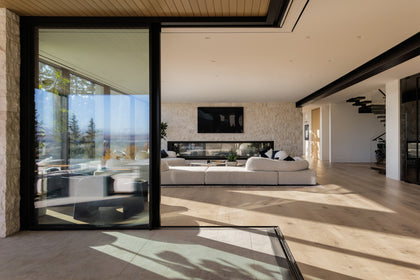 A seamless indoor outdoor connection defines another moment in the home. Large glass panels slide open in a single motion, allowing sunlight to wash across the floors and the landscape to appear almost within reach, expanding the living space and inviting the surroundings inward.
