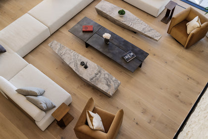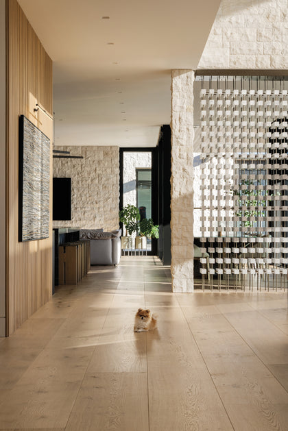 Inside, light moves across the Northern Wide Plank Dover XL floors from their Studio Reserve collection, settling into the warm texture of the wood and guiding the rhythm of the interior. A small dog resting at the center of the room offers a reminder that even the most meticulously crafted environments are meant to be lived in.