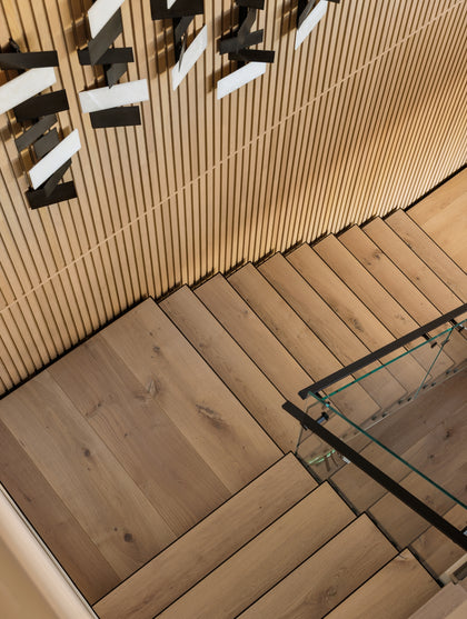 The staircase continues the story of cohesion. Crafted with treads made from the same Dover XL Ultra Wide Plank material, each step aligns in colour, tone, and texture, uniting all three levels.